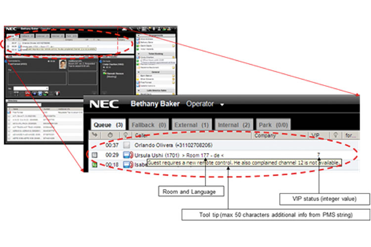 Система Business ConneCT, разработанная компанией NEC, с ее интуитивным интерфейсом, директорией имен и средствами отправки сообщений, выводит возможности оператора любого отеля на новый уровень. Система сразу показывает - откуда совершается звонок: по внешней, внутренней или перенаправленной связи. Звонки всегда переадресовываются нужным образом и, взглянув на очередь поступивших звонков, операторы могут легко определить звонящего, тем самым заранее зная конкретные нужды звонящего (будь то VIP-персоны, возвращающиеся клиенты, и т. д.).
